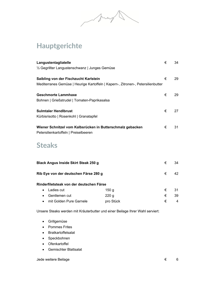 Ladies cut 150 g - € 31 Gentlemen cut 220 g - €39 mit Golden Pure Garnele (pro Stück) - € 4 // with Golden Pure prawn (per piece) - € 4